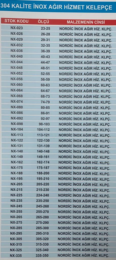 Takviyeli İnox kelepçenin liste harici olan ölçüleri özel imalat yapılabilmektedir.